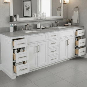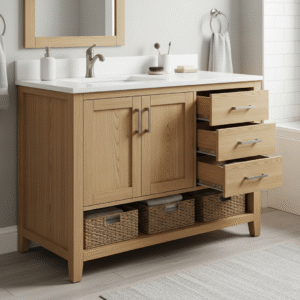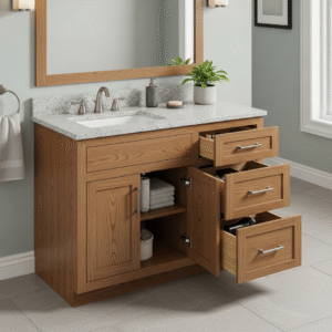 For those who want more counter space without committing to a double-sink design, the 48-inch vanity is a perfect middle ground. It’s well-suited for shared bathrooms where two people may need space at the same time. With generous storage underneath, these cabinets can easily hold baskets, skincare products, and grooming essentials. Many homeowners love 48-inch vanities for kids’ bathrooms, as they provide long-term functionality as the family grows.